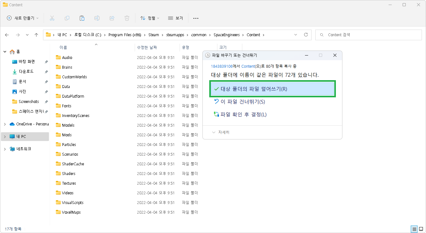 6. 붙여넣기 하실때 대상 폴더의 파일 덮어쓰기 눌러주시면 됩니다.