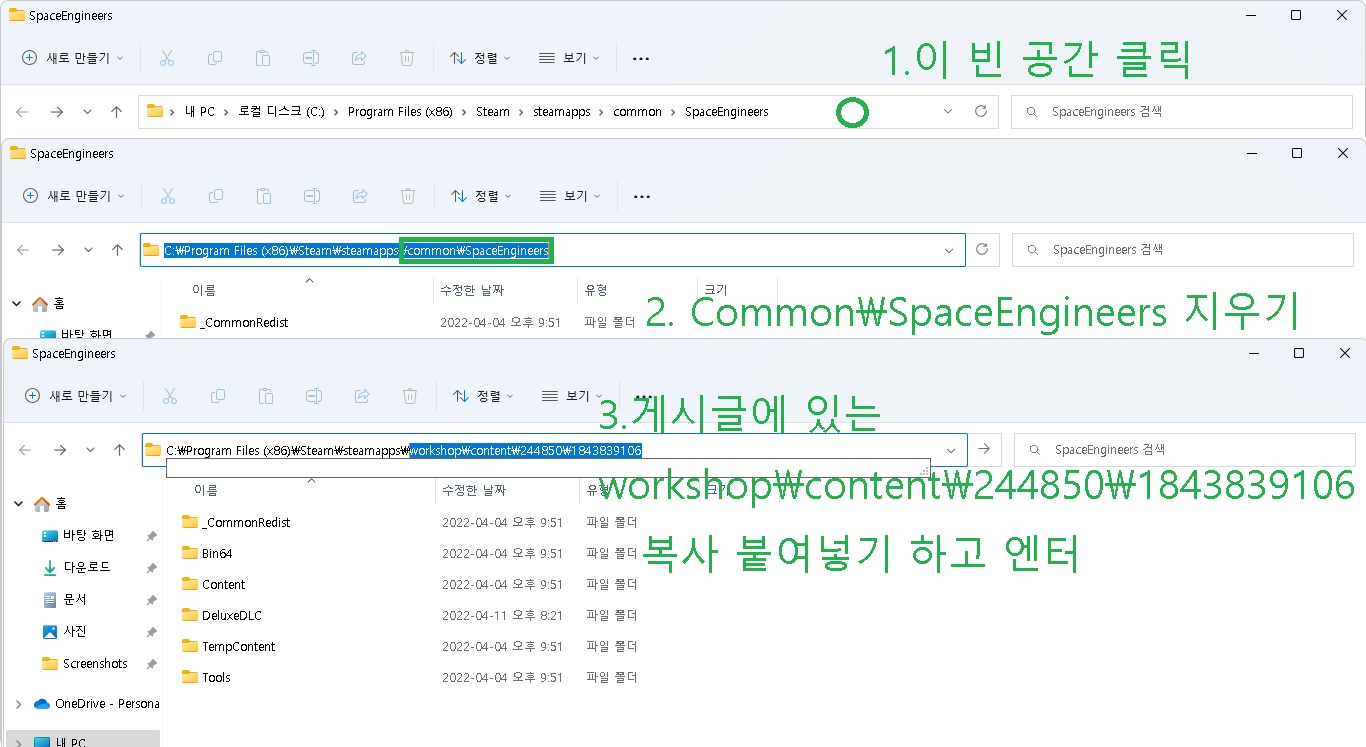 3.폴더 경로 오른쪽 빈공간을 클릭 Common\SpaceEngineers를 지워주시고 workshop\content\244850\1843839106 를 입력해주시면 됩니다.