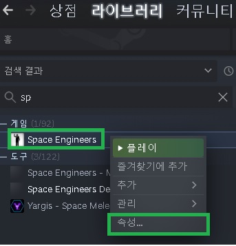 1.스팀 라이브러리를 키시고 스페이스 엔지니어(Space Engineers) 오른쪽 클릭후 속성을 눌러주세요.